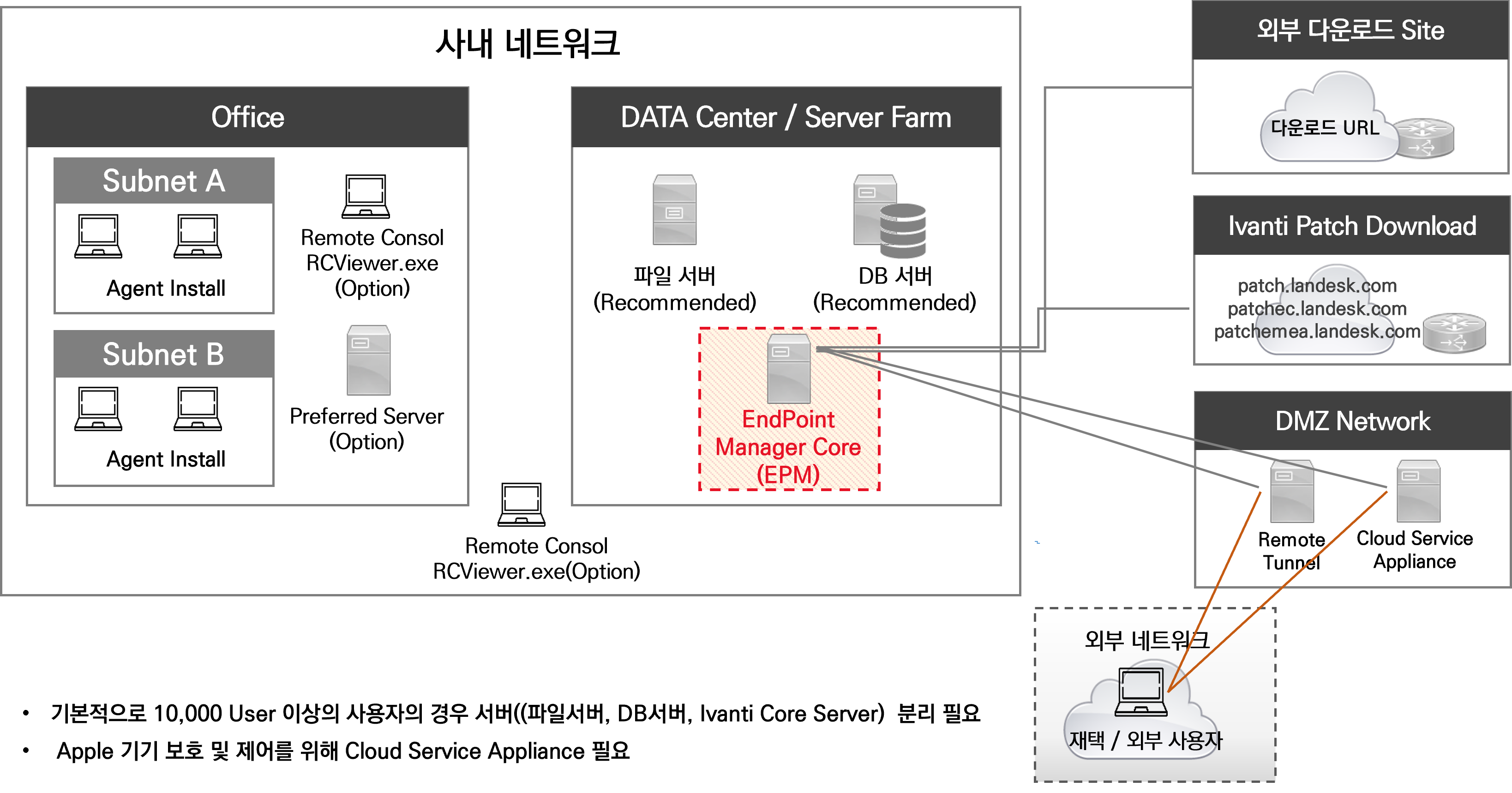 Ivanti End Point Manager´Â Áß¾Ó ÄܼÖÀ» ÅëÇØ ³×Æ®¿öÅ©, ´Ü¸», ¼¹ö¸¦ ¾Æ¿ì¸£´Â °èÃþÀû ±¸Á¶·Î °ü¸®°¡ °¡´ÉÇÕ´Ï´Ù.